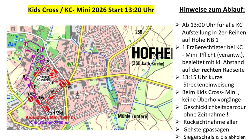 | Start Innenstadt Hofheim um 14:00 Uhr Kids Cross Start um 13:20 Uhr Check in Samstag, 09. Mai 2026, am Marktplatz/Hauptstraße in Hofheim von 10:30 bis 13:15 Uhr . | ||